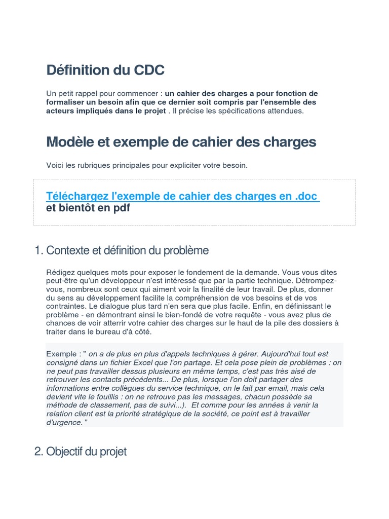 Détailler le contexte du projet contraintes techniques parties prenantes exigences particulières charte graphique livrable attendu. Il regroupe des informations sur les objectifs les besoins les spécifications et limpact dun projet ainsi que ses relations avec dautres projets. Il définit aussi les objectifs à atteindre et vise à bien cadrer une mission. Préciser et définir les objectifs et la finalité dun projet. Il était défini par chailland comme détail des principales conditions de la vente et des obligations de ladjudicataire. Outre les spécifications de base il décrit ses modalités dexécution.