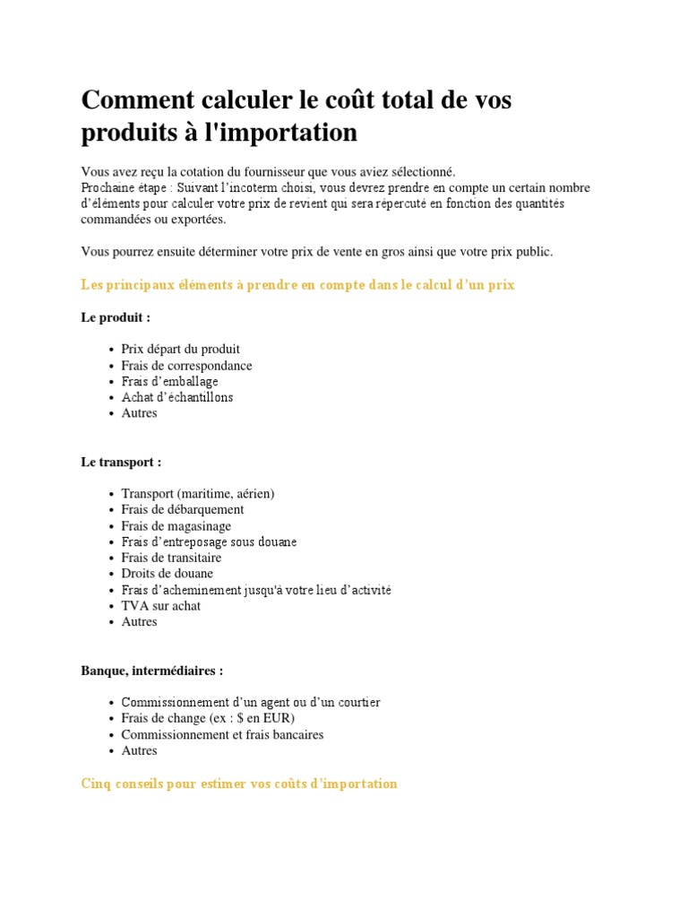 Calcul frais de douane. Chaque type de produit est identifié par un code de 10 chiffres qui définit le taux de douaneil existe plusieurs milliers de taux de droits de douane. Vous pouvez chercher votre taux sur le site web officiel de lunion européenne parcourir les sections. Frais de traitement des autres ministères 1600 chacun. En dehors de lapplication du taux forfaitaire à 25 voir ci dessus lors dimportation de marchandises originaires de pays situés hors de lunion européenne pays tiers les droits de douane sont calculés ad valorem sur la valeur cif valeur comprenant le coût dachat lassurance et le transport jusquà de destination pour les colis postaux par exemple de celles ci. Les droits de douanes sont calculés sur la valeur réelle de lobjet les frais de port lassurance. Exception de frais de livraison dans le cas des importations de biens non commerciaux les frais dexpédition ne doivent pas être inclus à moins quils ne soient inclus dans la valeur en douane de la déclaration en douane formulaire cn22 cn23 c1 ou déclarés par écrit ou verbalement.