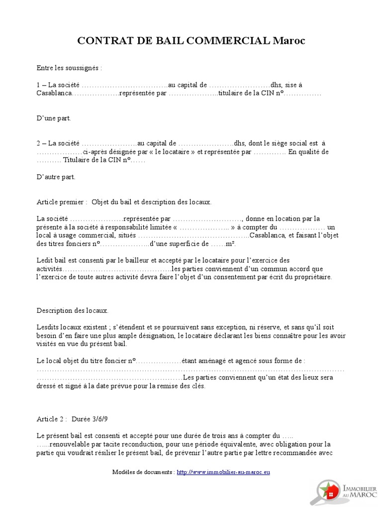 Contrat de bail commercial. A ce titre ce type de bail se voit appliquer des règles différentes du contrat de location portant sur un local à usage dhabitation. Par rapport aux baux classiques le bail commercial est soumis à un régime juridique particulier. Le bail nest commercial que sil répond aux exigences légales de larticle l. La réglementation sur le bail commercial a changée depuis le 11 février 2017 date de lapplication de la loi 49 16 relative aux baux immeuble et locaux commerciaux. Un contrat de bail un local commercial un fonds de commerce et limmatriculation du preneur. Sa fonction première est de régir les obligations et les droits du bailleur ainsi que du locataire aussi appelé preneur dans le cadre de leurs interactions relatives à la location en question.