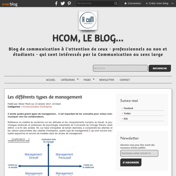 La motivation de nos collaborateurs est fondée sur trois facteurs. Cet article vous donne la définition des différents modèles de management ainsi que des exemples concrets. Parmi les différents types de management le management délégatif est celui qui responsabilise le plus les membres de léquipe. Les types de collaborateurs. En somme ce style est une combinaison des trois autres types de management. Quels sont les traits caractéristiques des différents types de management.