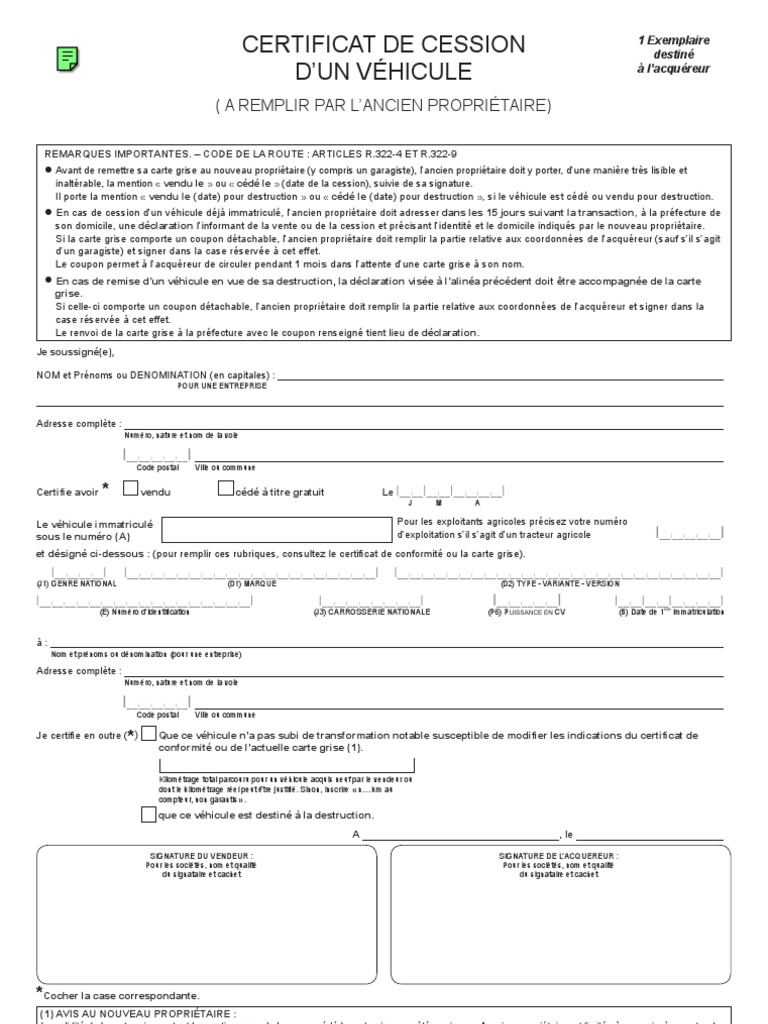 Document vente de v hicule. En cas de cession vente ou don de votre véhicule déjà immatriculé vous devez faire parvenir à la dittt dès la transaction intervenue une déclaration informant de la cession et indiquant lidentité et le domicile déclarés par l. Le certificat de cession constitue une preuve de vente et permet de déclarer auprès de ladministration le transfert de propriété et de responsabilité qui découle de la vente du véhicule. Le certificat de vente dun véhicule doccasion prend la forme dun formulaire cerfa voir quest ce quun cerfa que lacheteur et le vendeur doivent tous les deux remplirce document permet de formaliser la cession du véhicule mais sert aussi de justificatif auprès de ladministration pour prouver la vente ou lachat. Ce document cerfa permet au vendeur de préparer toutes les informations utiles à la télédéclaration de cette vente auprès de lagence nationale des titres sécurisés ants. Propriétaire avec les autres éléments nécessaires à la vente. Lassurance du véhicule sera suspendue à compter de la date de cession à minuit.