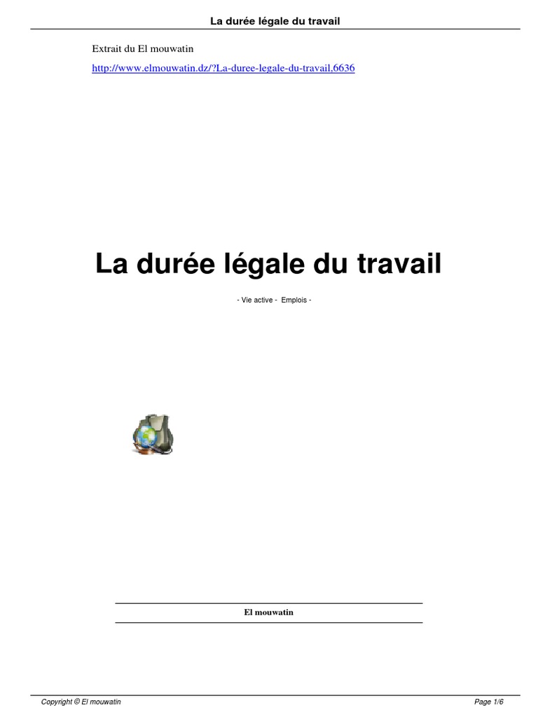 Durée légale du travail art1 le présent décret pris en application des dispositions de larticle 165 du code du tra vail réglemente le régime des dérogation à la durée légale du travail. 8 v la durée légale de travail effectif des salariés à temps complet est fixée à trente cinq heures par semaine. Il existe toutefois des durées maximales au delà desquelles aucun travail effectif ne peut être demandé. Historiquement la durée légale du travail a été réglementée par quelques lois célèbres léphémère loi des dix heures en 1848 la loi du 29 juin 1905 sur la durée du travail dans les mines la journée des huit heures en 1919 puis les décrets du front populaire instituant la semaine de quarante heures enfin les lois de 1982 passées lors du premier mandat de mitterrand les. Sauf dérogations le salarié est soumis à une durée légale de travail de 35 heures par semaine. Chapitre 1 des dérogations permanentes particulières aux activités à fonctionnement continu non susceptible dinterruption art2.