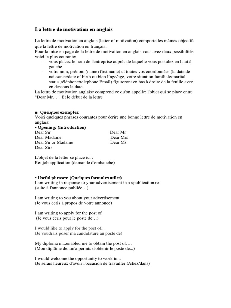 Vous pourrez trouver un exemple de lettre de motivation en anglais ci dessous. Dear mr jones ou dear mrs jones. Vous pouvez en revanche ladapter pour dautres situations comme un cursus universitaire à létranger. Les règles de rédaction en anglais et français sont différentes pour les lettres de motivation. Traductions en contexte de lettre de motivation en français anglais avec reverso context. Dans la suite je te présente ce quil ne faut pas faire les erreurs à éviter et je te montre lexemple à suivre.