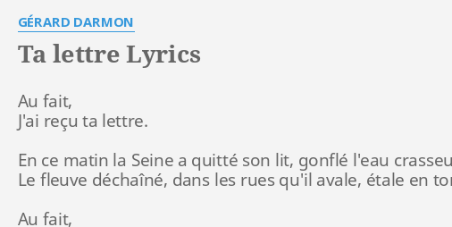 J ai re u une lettre. Jai reçu une lettre dhuissier que faire. Please try again later. Renan luce 2209894 views. Par exemple jai reçu une lettre de la mairesse de lac mégantic. For example i received a letter from the mayor of lac mégantic. Em 022000 c 032010 am 002210 em 022000 intro em c am em bis couplet 1 em jai recu une lettre c il y a un moi peut etre am arrivee par erreur em maladresse du facteur em aspergee de parfum c rouge a levre carmin am jaurais du cette lettre em ne pas louvrir peut etre c mais moi je suis un homme am qui aime bien ce genre de jeu c je veux bien quelle me nomme am em alphonse ou fred c.