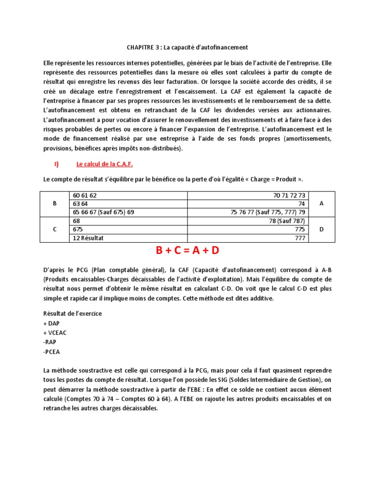 La capacit d autofinancement. Interpréter le calcul de la capacité dautofinancement. La capacité dautofinancement caf correspond à la différence entre les produits encaissables et les charges décaissables. On retrouve cet indicateur dans les tableaux de financement à côté des autres leviers de financement que sont les augmentations de capital les emprunts ou bien les cessions dactif. Interpréter et utiliser la capacité dautofinancement. Abrégée caf la capacité dautofinancement caf peut se définir comme lensemble des ressources produites par lactivité dune société servant dassurer son financement. La capacité dautofinancement ou caf désigne lensemble des ressources brutes restant à une entreprise à la fin dun exercice.