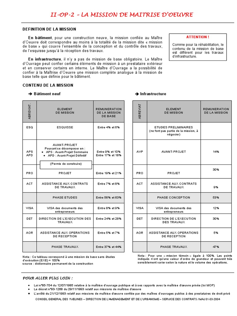 La mission de maîtrise dœuvre est distincte de celle confiée aux opérateurs économiques chargés des. Les éléments de mission dépendent de la catégorie de louvrage selon quil sagit douvrages de bâtiment ou douvrages dinfrastructure.