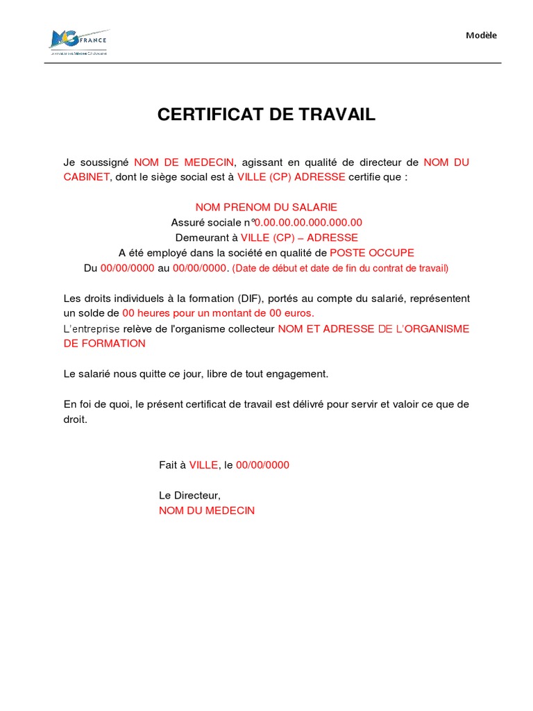 Modele de certificat de travail. Demeurant adresse de lemployeur. Le certificat de travail doit être remis au salarié quel que soit le motif de la rupture de son contrat de travail. Lorsquun salarié quitte son entreprise il doit recevoir un certificat de travail. Si lemployeur ne remet pas de certificat de travail au salarié qui quitte lentreprise il encourt lamende prévue par larticle r. La société raison sociale de la société certifie que madame monsieur prénom nom demeurant adresse du salarié a été employée employé dans lentreprise sous contrat nature du contrat cdi cdd du date dentrée dans lentreprise au date de sortie de lentreprise en qualité de fonction du salarié. Il est dû au salarié pour tout type de contrat de travail cdi cdd quel que soit le motif de.