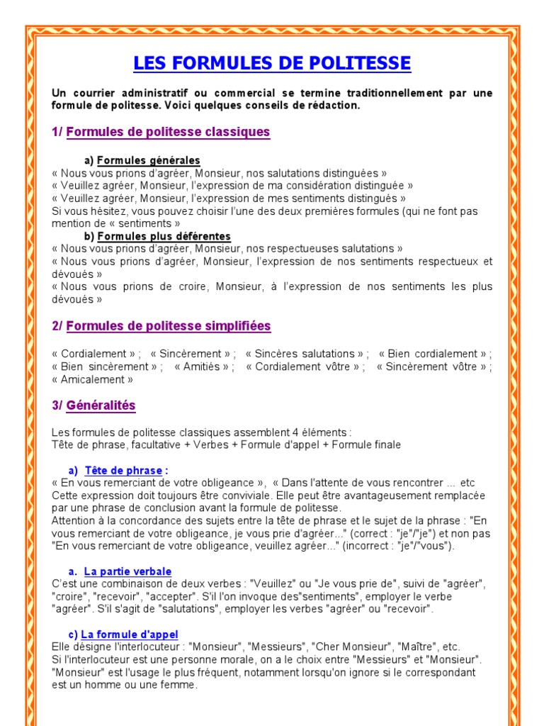 Un courrier administratif ou commercial ou une lettre personnelle se terminent par une formule de politesse nous vous proposons différentes formules de politesse classées par destinataires et type de courrier. Lors de la rédaction dun courrier la formule de politesse phrase se plaçant en fin de lettre est plus ou moins convenue et solennellegénérales déférentes ou conviviales les formules de politesse différent selon le destinaire du courrier. La lettre de motivation et autres courriers administratifs sont bien standardisés les formules de politesse encadrant celles ci sont très importantes à respecter pour donner une bonne.