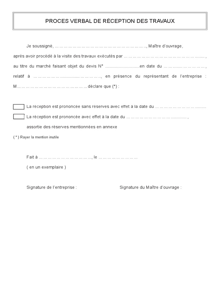 Personne dautre que le commanditaire des travaux nest en mesure détablir le procès verbal entre vous et les entreprises concernées. Pour les travaux faisant lobjet dun marché n ou dune commande en date du. Officiel ou mandaté par le client. Procès verbal de réception avec ou sans réserves le modèle ci après nest communiqué quà titre indicatif et doit être adapté à chaque situation. Phase clé dans le cycle de vie dun ouvrage la réception des travaux marque lachèvement dun chantier de constructioncette étape essentielle se traduit sur papier par le procès verbal de réception de travaux ou pv de réception de travauxrempli par le commanditaire du projet ce document atteste de la bonne conformité du chantier réalisé par lartisan. En allemagne dans le cas du certificat de réception et du procès verbal de réception la din 50049 fait une distinction suivant que lexpert est.