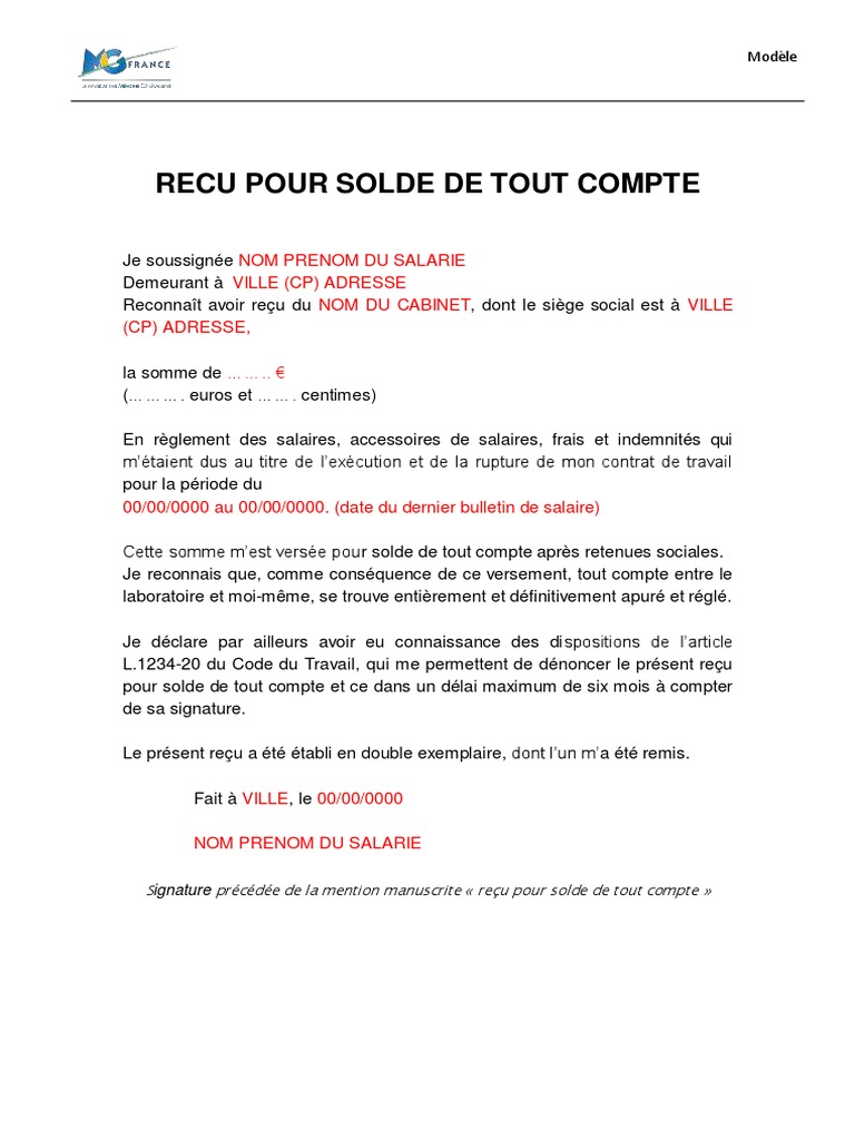 Recu pour solde de tout compte. Le solde de tout compte est établi par lemployeur et remis contre reçu au salarié. Par la présente je reconnais avoir reçu de la part de la société nom pour solde de tout compte les sommes inscrites ci dessus. Passé ce délai je ne serai plus en droit de le contester. Pour avoir un exemple de reçu pour solde de tout compte à faire signer au salarié lemployeur peut saider de notre modèle gratuit de reçu pour solde de tout compte. Le dater et le signer puis de nous le remettre. Ce reçu pour solde de tout compte peut être dénoncé par lettre recommandée dans les 6 mois à compter de la date de signature.