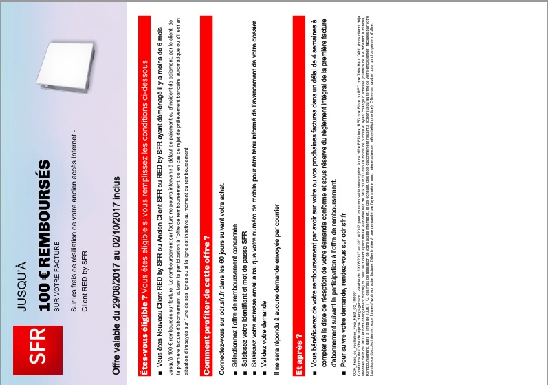 Sur les frais de résiliation de votre ancien accès internet client red by sfr jusquà 100. Pour bénéficier de la prise en charge par sfr des frais de résiliation de votre ancien fournisseur daccès internet dans la limite de 100 vous devez vous connecter sur le site odrsfrfr dans les 60 jours suivant votre souscription. Si le client demeure engagé il faut ajouter à ces 49 le montant total des mois dengagement restants. Si le titulaire de loffre sfr est décédé ou quil est incarcéré ou quil doit déménager à létranger. La rupture peut alors être considérée comme légitime par sfr qui procèdera alors au remboursement de vos frais de résiliation. Pour briser le contrat dune box sfr internet le client doit payer la somme forfaitaire de 49 euros.