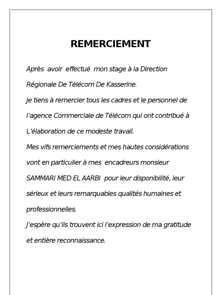 Mis à jour le. Après lannonce du plan et juste avant lintroduction. Remerciements du rapport de stage exemple 1 je tiens à remercier dans un premier temps toute léquipe pédagogique de nom de lécole et les intervenants professionnels responsables de la formation intitulé de la formation pour avoir assuré la partie théorique de celle ci. Stage en entreprise pratique après le stage rapport de stage remerciement rapport de stage. Le rapport de stage est une étape obligatoire dans la scolarité. Il est important de faire une lettre de remerciements pour la personne qui vous a permis dobtenir ce stage.