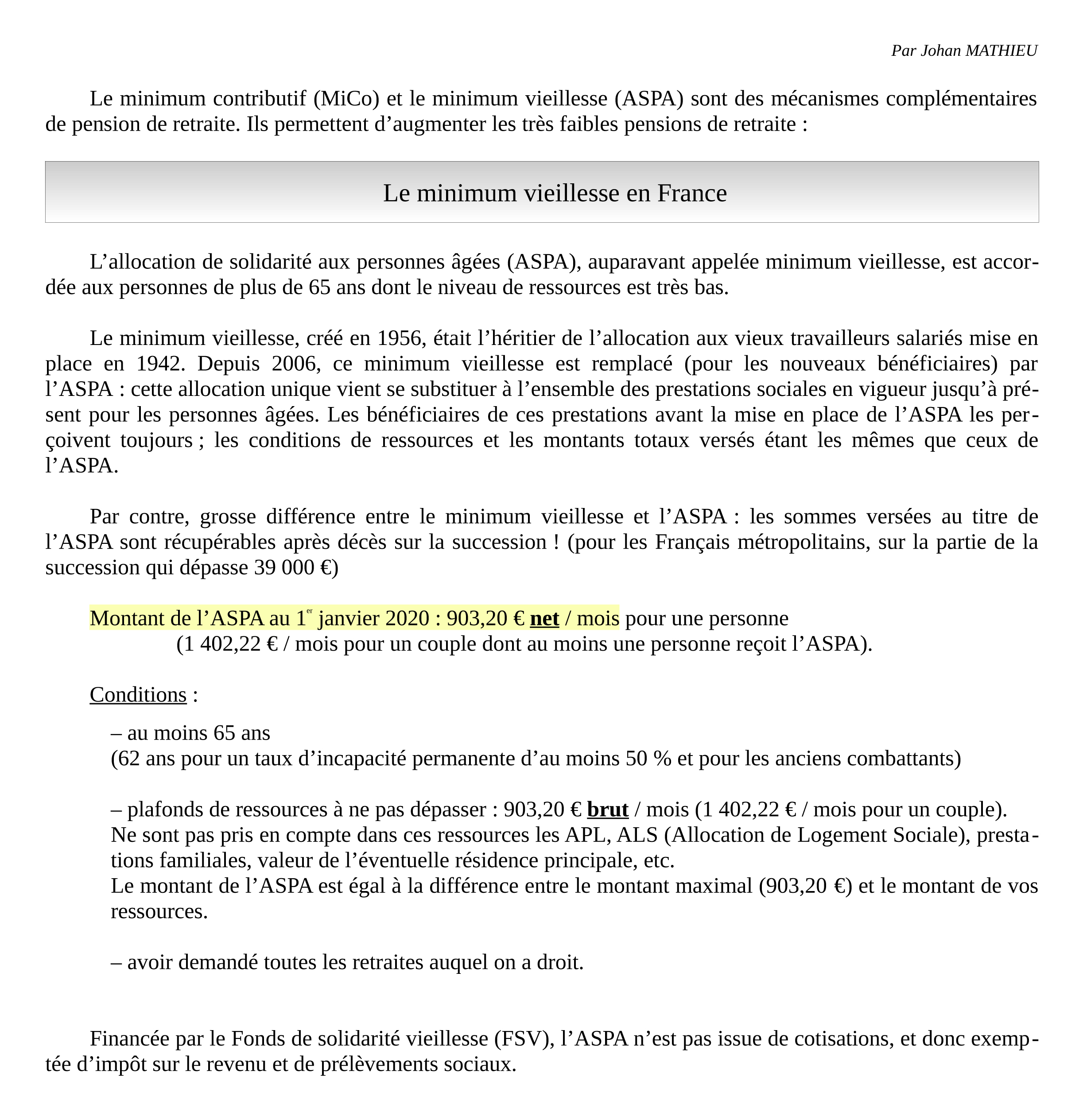 Retraite minimum en france. Dans le système universel le minimum de retraite sera augmenté à 1 000 euros par mois 85 du smic net et sera le même pour tous. Pension de retraite minimum sera mise à jour significativement. Même en ayant peu cotisé vous pouvez prétendre à revenu minimum un fois à la retraite. Le montant minimum de la retraite de base dans les régimes alignés est appelé minimum contributifen plus de la condition du taux plein lassuré qui peut en bénéficier doit respecter les conditions suivantes. Pour 2020 le montant maximum de laspa pour une personne seule est de 10 83840 euros par an soit 9032 euros par mois contre. En termes de minimum retraite le minimum contributif correspond au minimum retraite de la retraite de base des assurés ayant atteint la durée de cotisation légale ou ceux ayant atteint lâge de la retraite à taux plein pour savoir quelle est votre durée de cotisation légale ou encore quel est votre âge départ à taux plein vous pouvez visiter notre page dédiée.